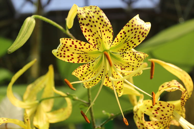 6月から7月で、花弁は強く反り返り、黄地に赤の斑点を生じる。葉の付け根にムカゴを作るが、種子をつける物が